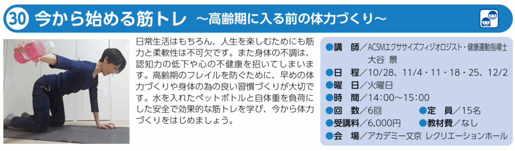 Elementor #1919 August 5, 2025 August 15, 2025 文京アカデミーの後期講座の募集が始まりました。今から始める筋トレ~高齢期に入る前の体力づくり~と言う講座を担当致します。パンフレットはこちらから!ご参加お待ちしております。